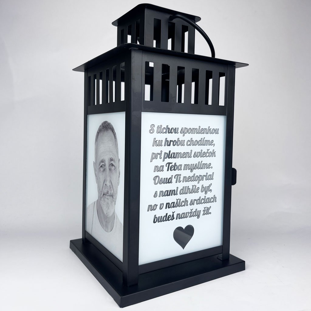 Lampáš s fotografiou a textom "S tichou spomienkou...", farba: čierny, biely