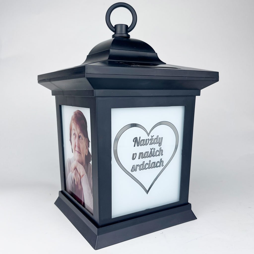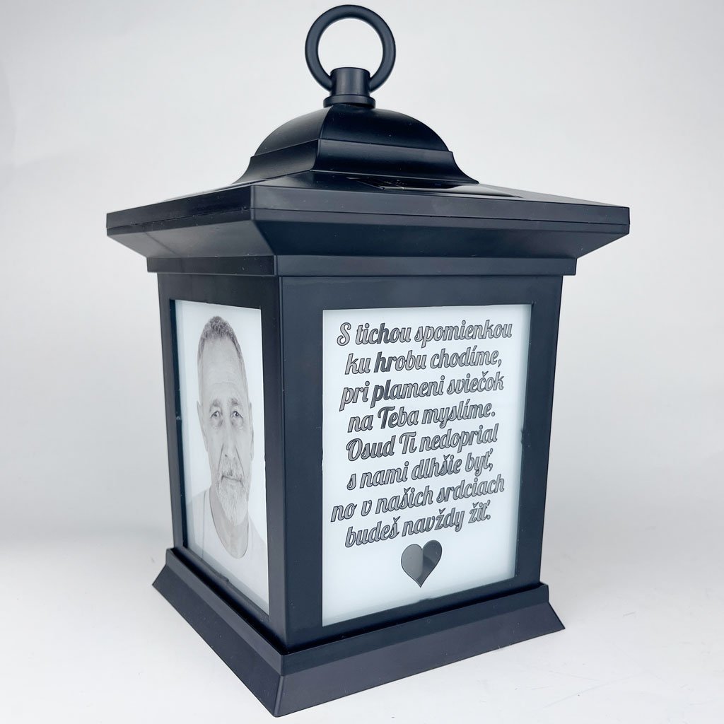 Solárny LED lampáš doplnený Vašou farebnou, alebo čiernobielou fotografiou a predvoleným textom a obrázkom. Vyberte si jeden z daných textov a nahrajte Vašu fotografiu: